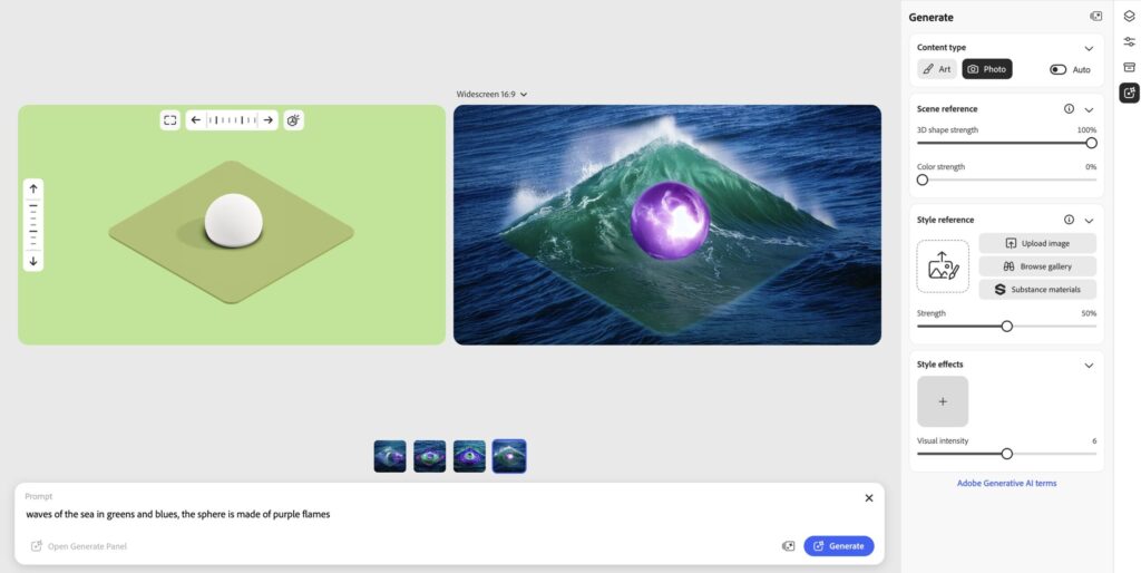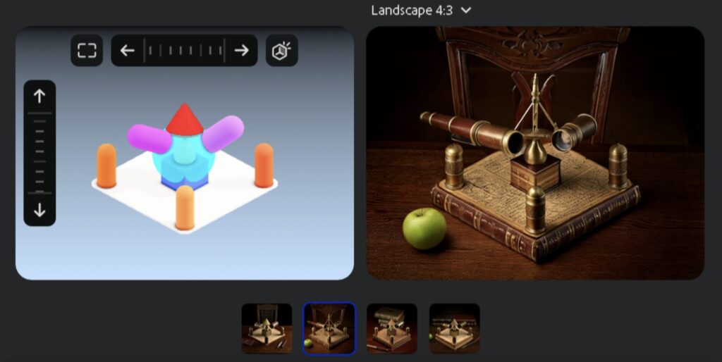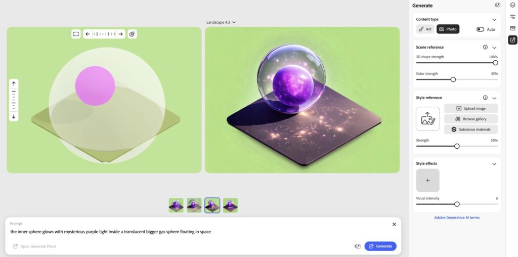 B) use the Generative AI tools in NEO to transform your 3D design into a 2D realistic image, using an efficient and precise prompt. Explore Photo / Art versions. I need to see the prompt and export each one of the 4 variations Neo provides.